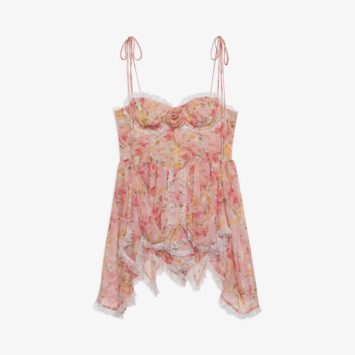 Robe de soirée trapèze vintage en dentelle florale, bretelles spaghetti et ourlet volanté, D1421