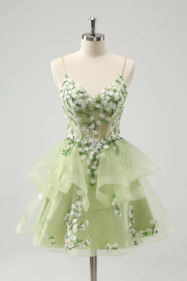 Robe de soirée trapèze à bretelles fines et motif floral brodé vert menthe vintage, D1356