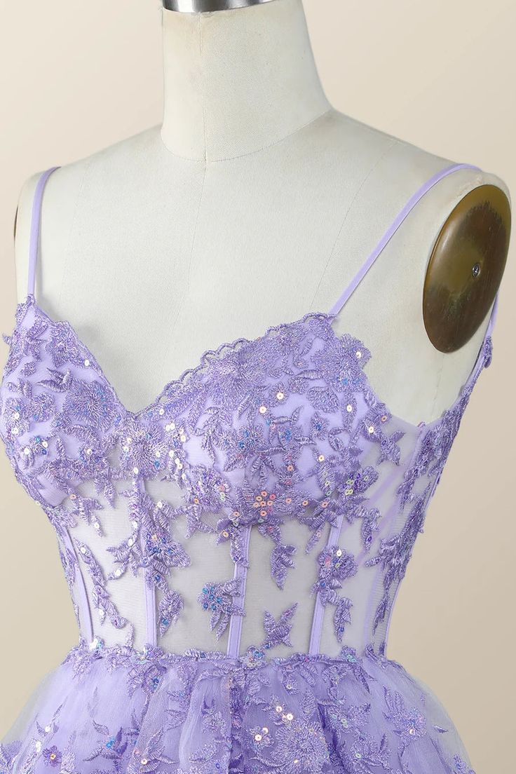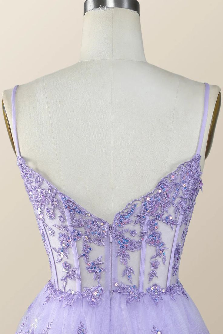 Robe de soirée trapèze à bretelles fines et à volants, motif à paillettes violet vintage, D1357