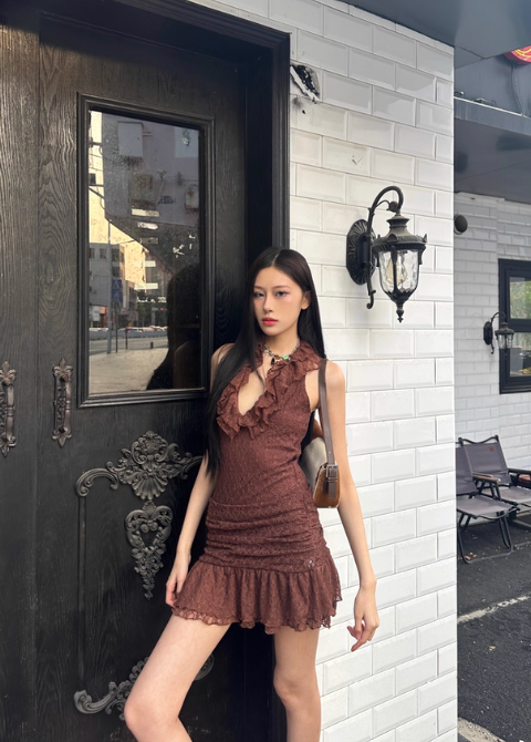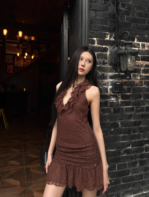 Robe d'été vintage à col en V et jupe courte plissée à volants marron pour femme, tenue de vacances ou de rendez-vous, D1884