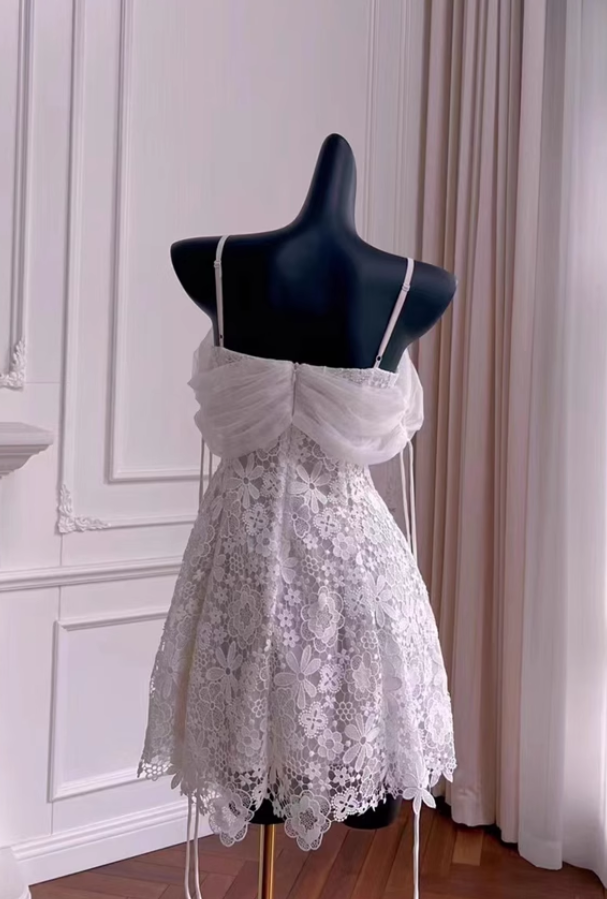 Robe de soirée trapèze vintage blanche à bretelles spaghetti et appliqués, robe de bal, D1341