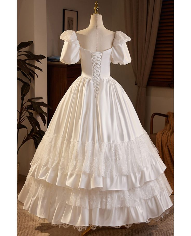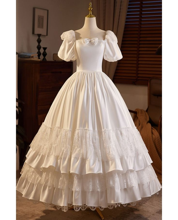 Robe de mariée longue blanche en satin et dentelle, coupe trapèze, manches courtes, MD7324