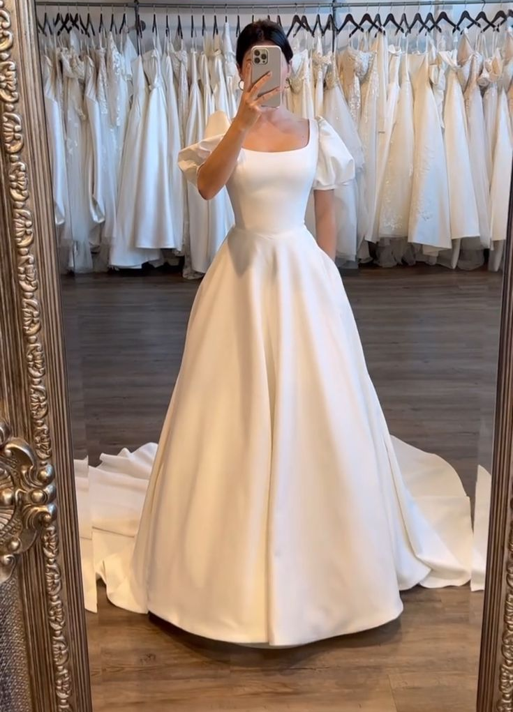 Robe de soirée longue blanche en satin à manches courtes et coupe trapèze, robe de mariée MD7462