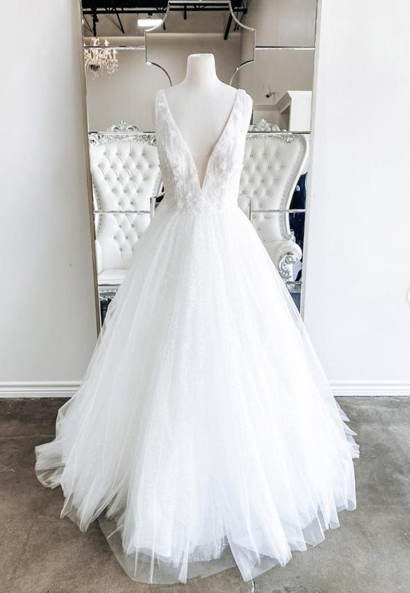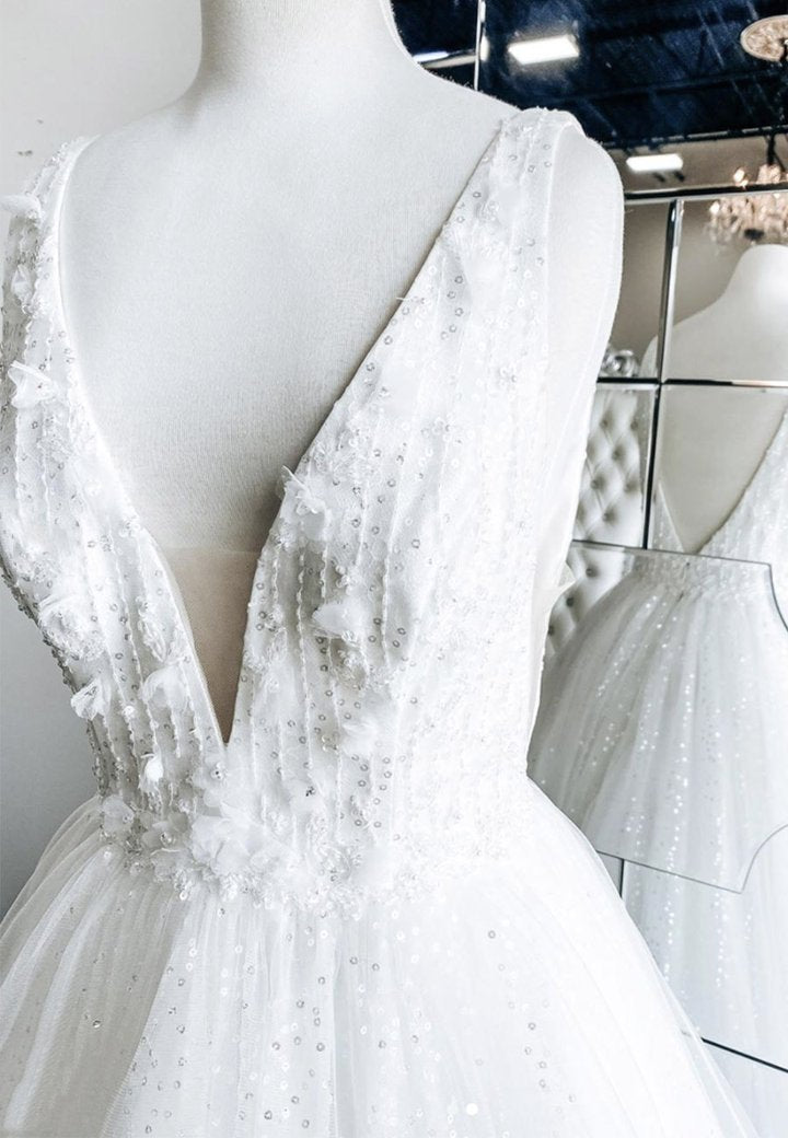 Robe de bal longue blanche à paillettes et col en V en tulle M681
