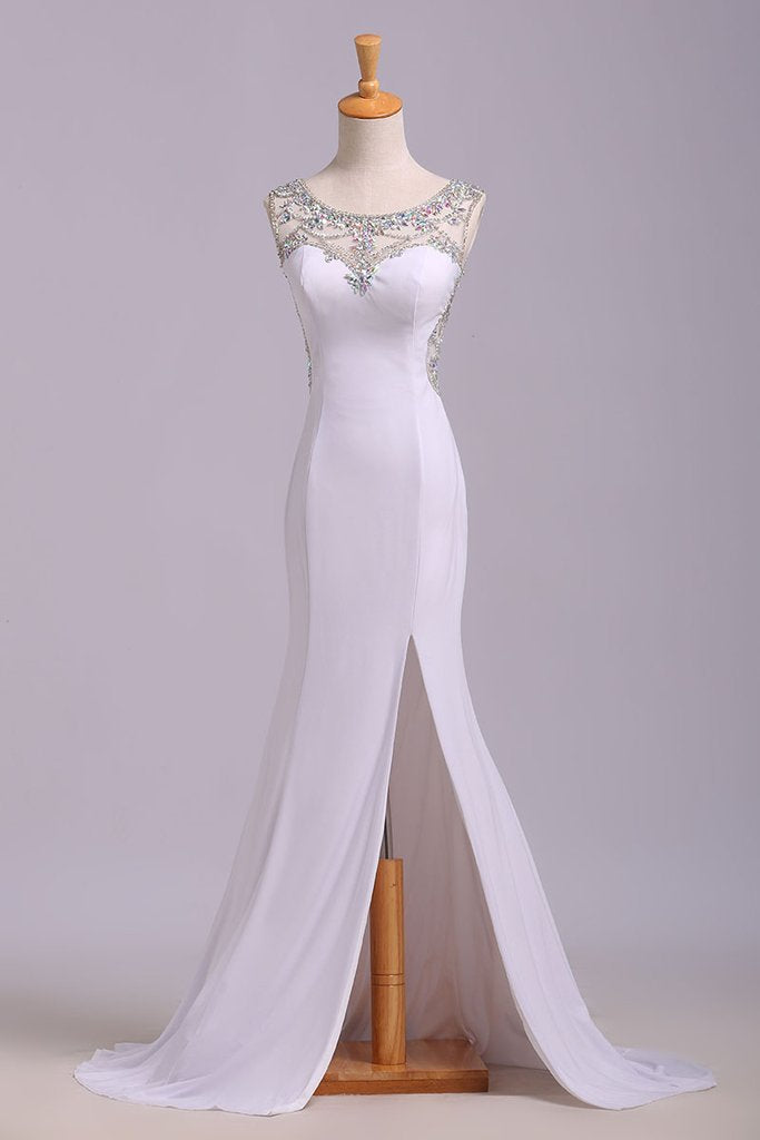 Robe de bal sirène blanche sans manches, fendue, avec paillettes et traîne à strass M1511