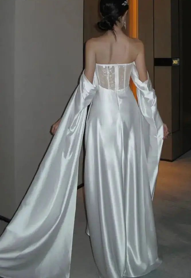 Robe de bal longue blanche en satin et dentelle, épaules dénudées, robe de mariée MD7537