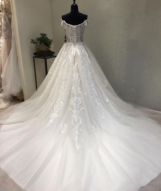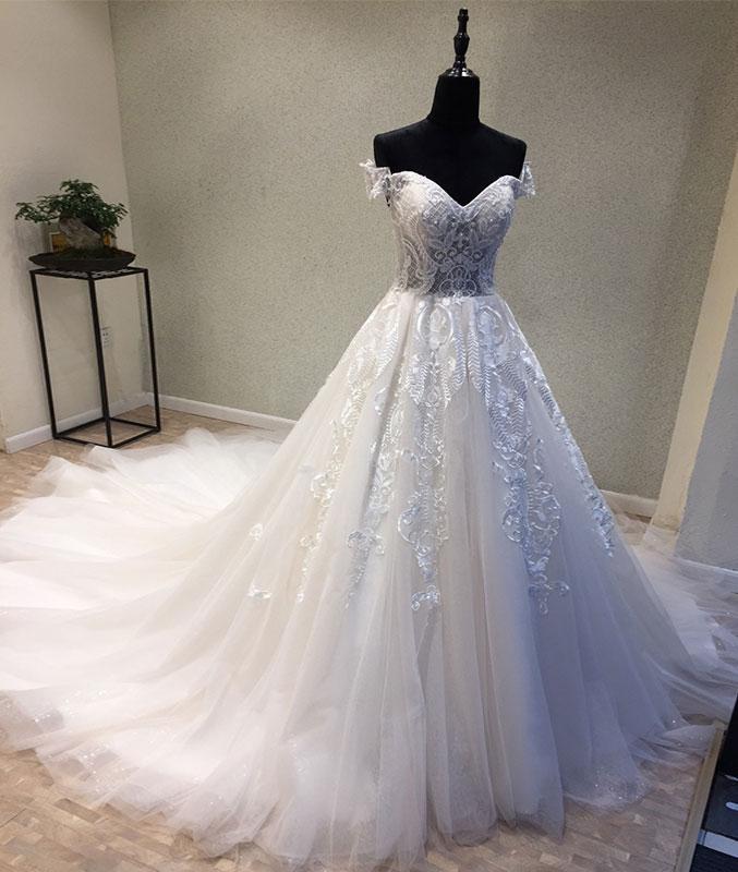 Robe de bal longue en tulle blanc avec appliques en dentelle et robe de mariée M4849