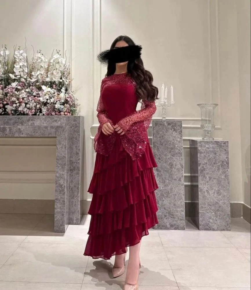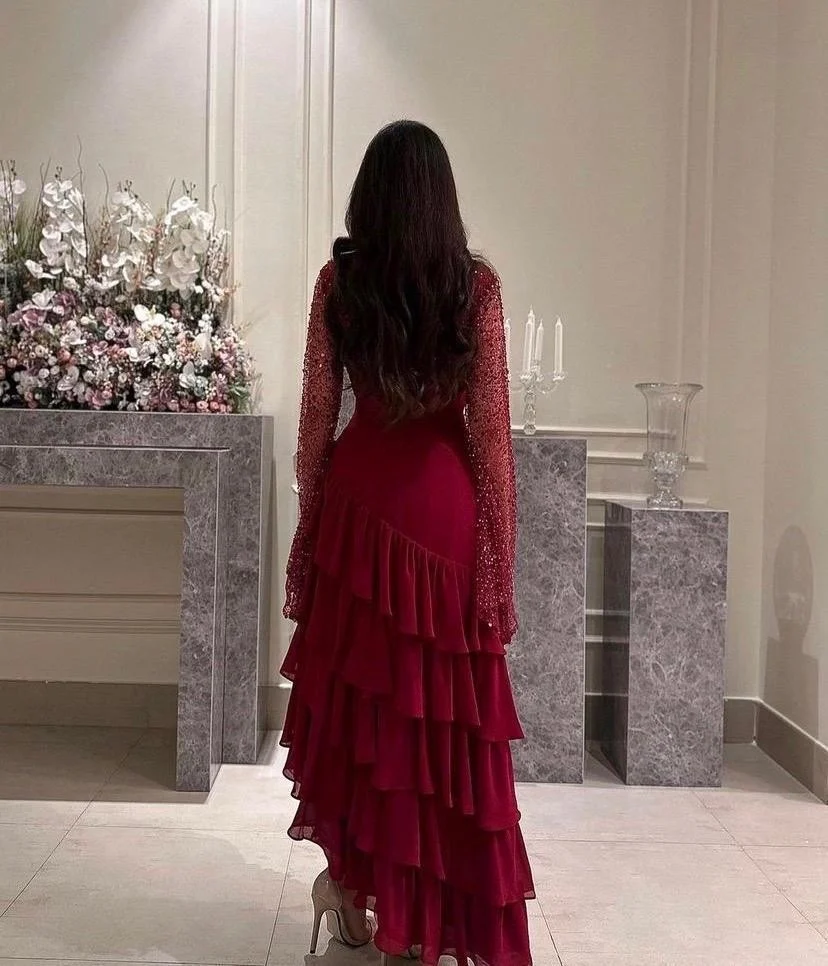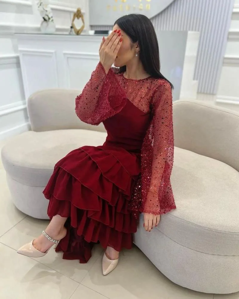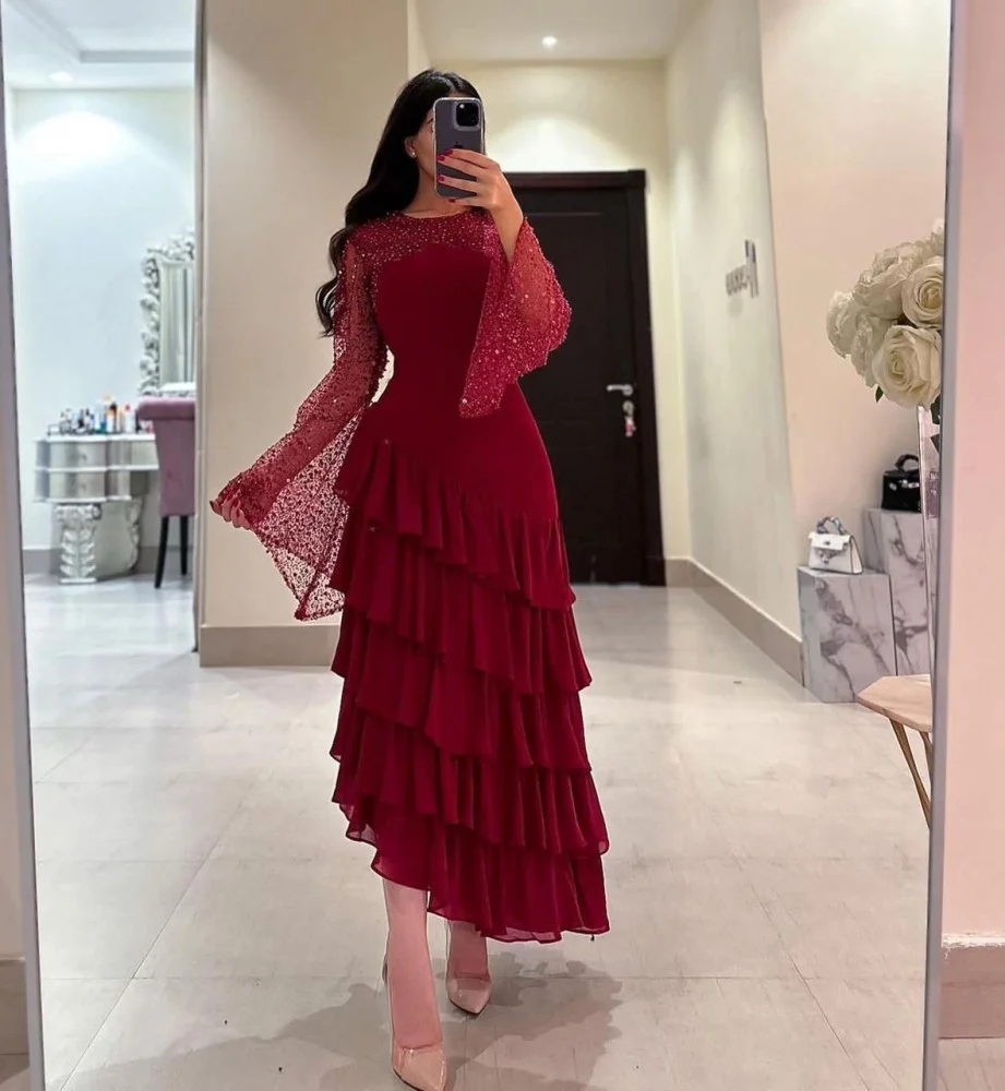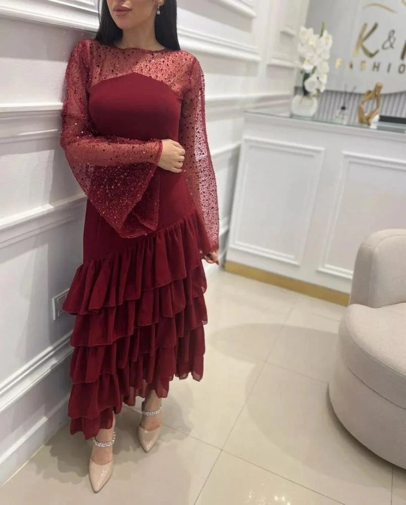 Robe de bal longue rouge vin à manches longues, coupe trapèze, à volants, MD7342