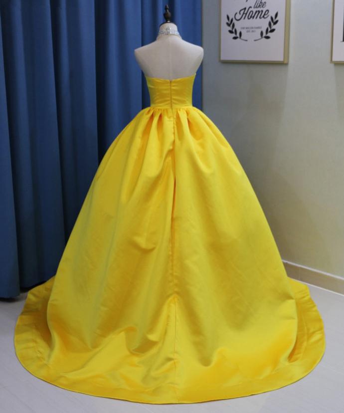 Robe de bal jaune à col montant et perles, longue robe de Quinceanera dos nu M1553