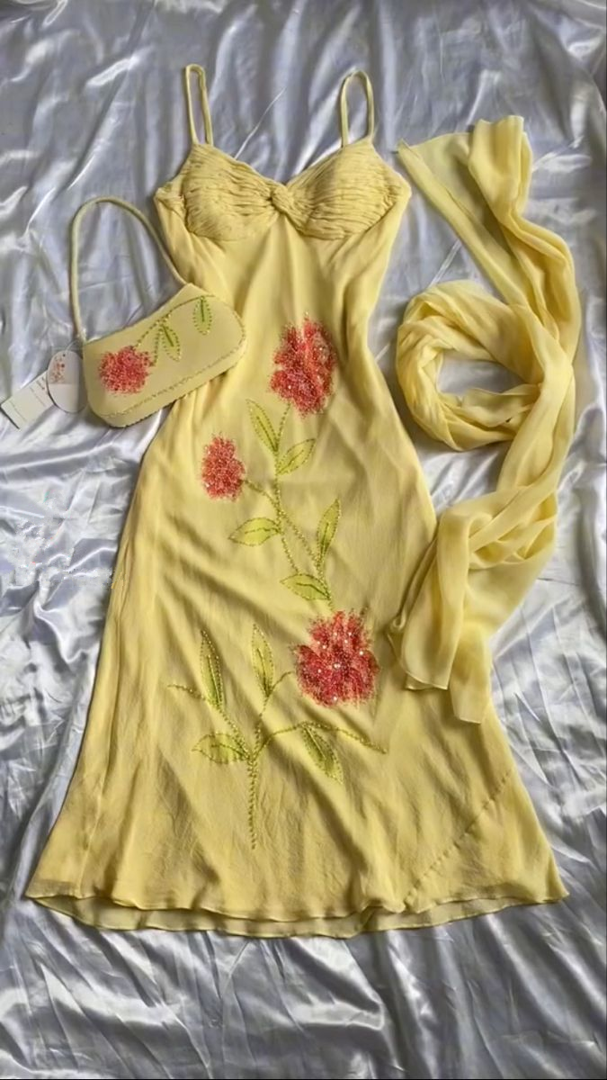 Robe de soirée longue vintage jaune à bretelles spaghetti et perles MD7752