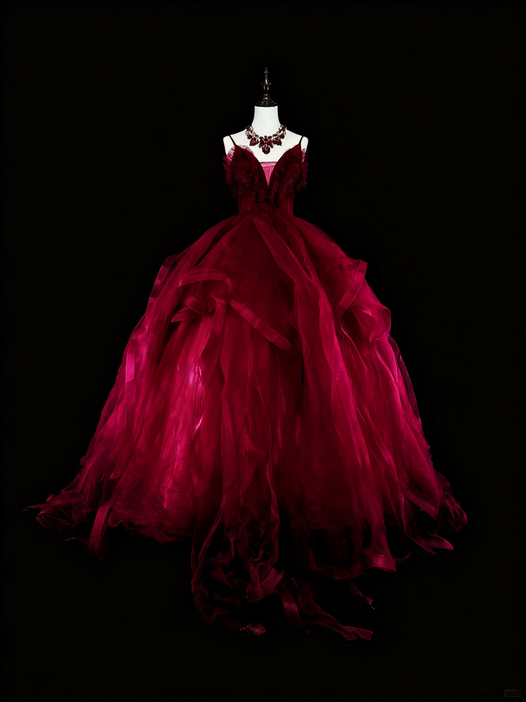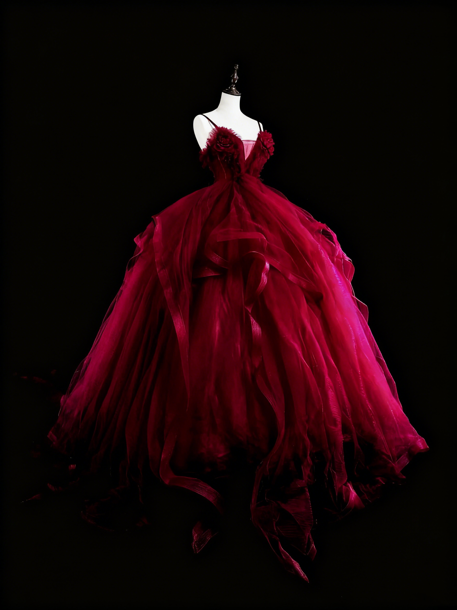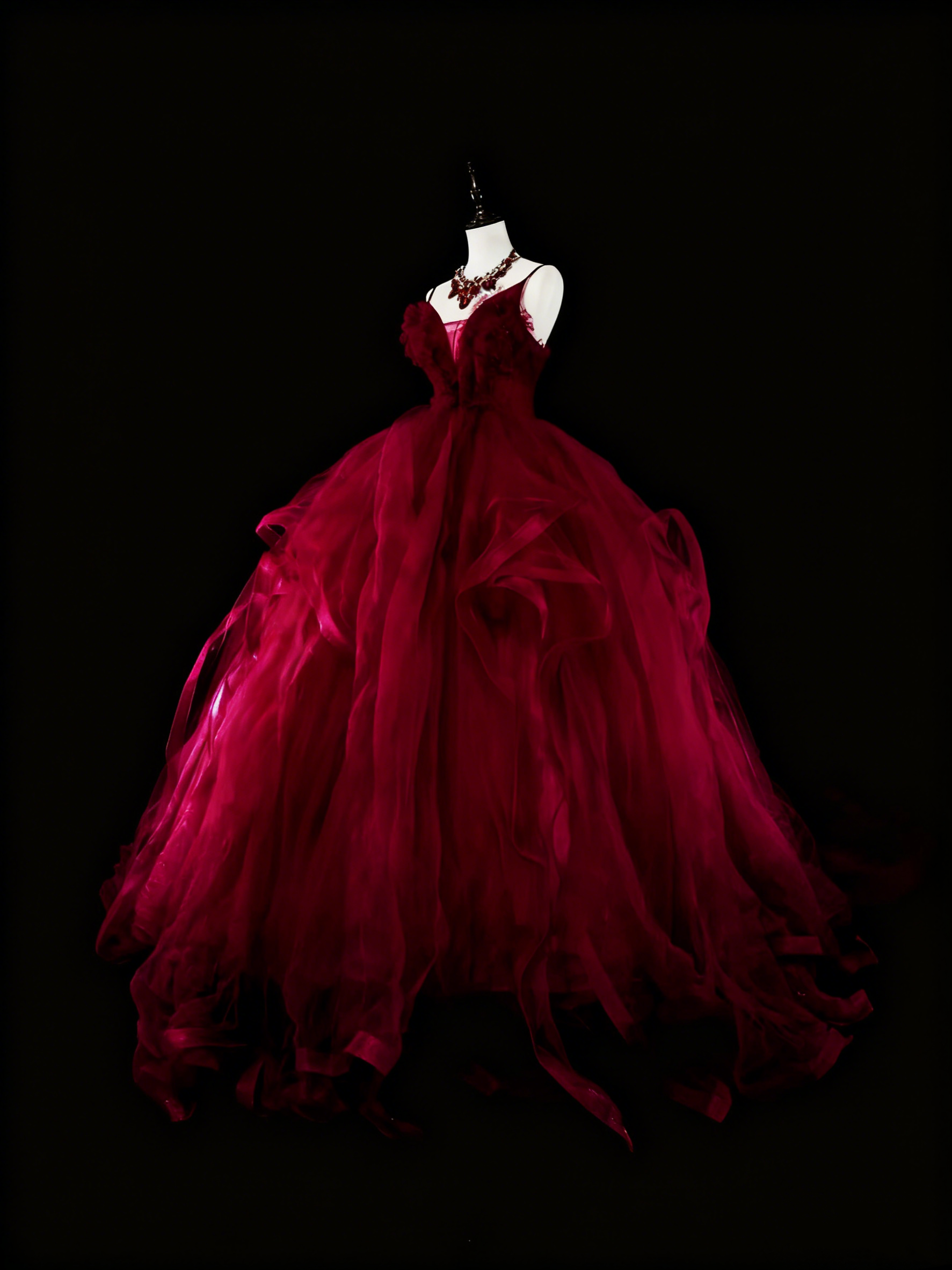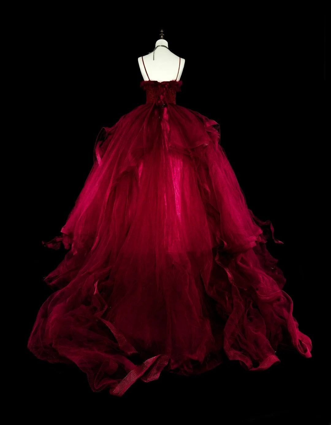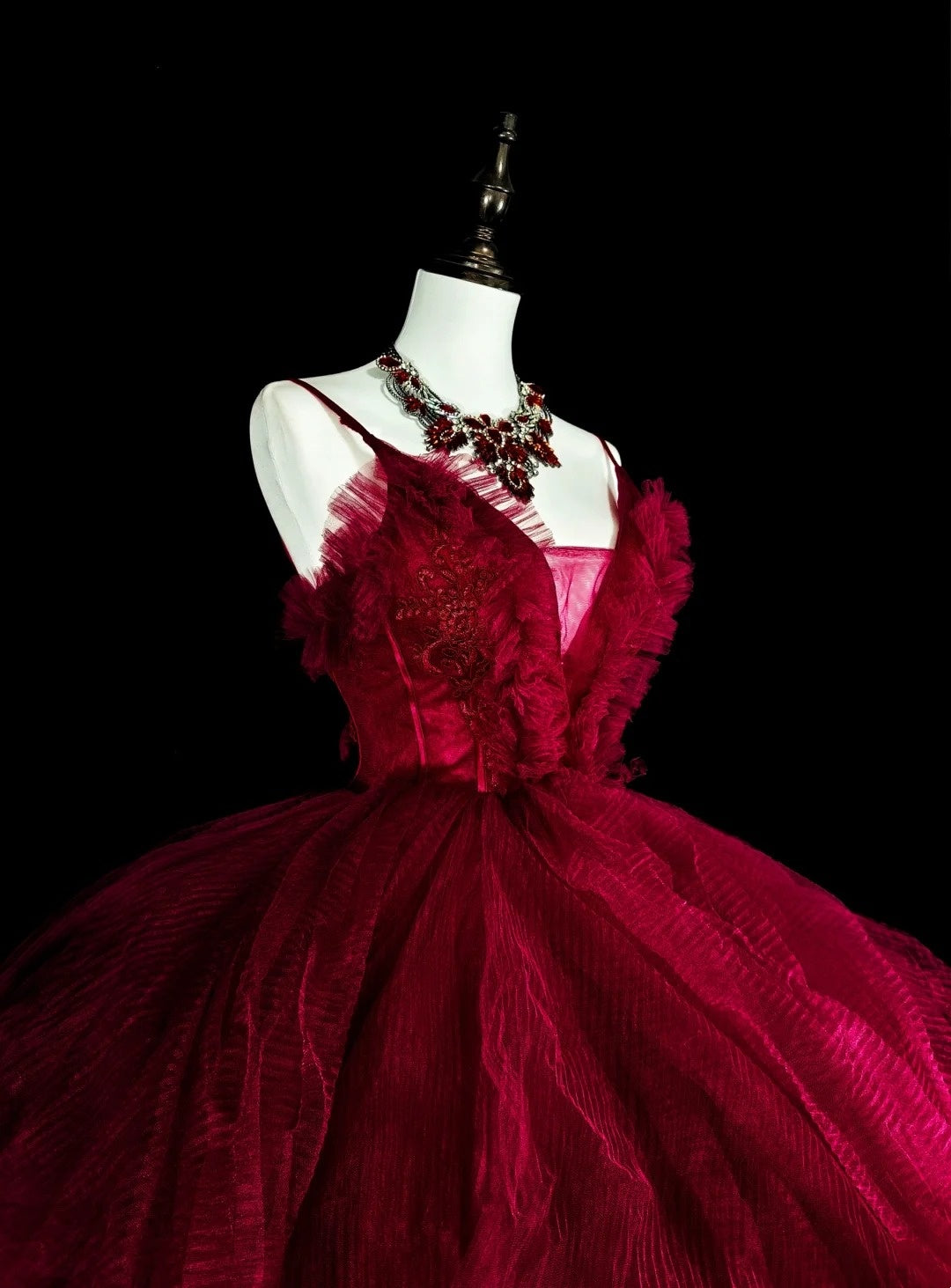 Charming Prom Dress Wine Red Spaghetti Straps Pleated Tulle Ball Gown Evening Dress Birthday Dress D3899