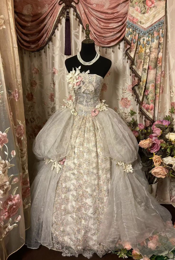 Elegant Strapless A-Line Lace Floral Long Party Dress Vintage Evening Dress, D402