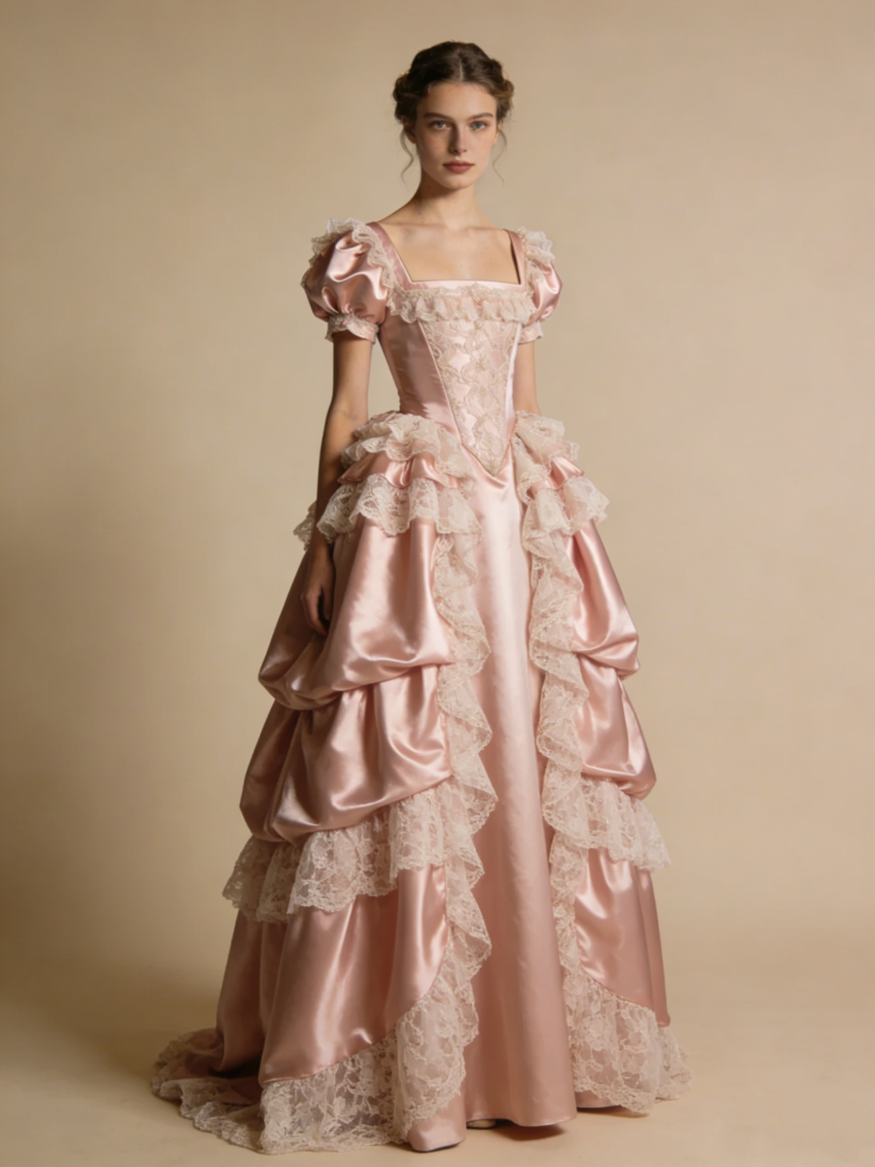 Light Pink Ball Gown Square Neck Lace Pleated Prom Dresses 17th Dress Evening Gala Gown D4814