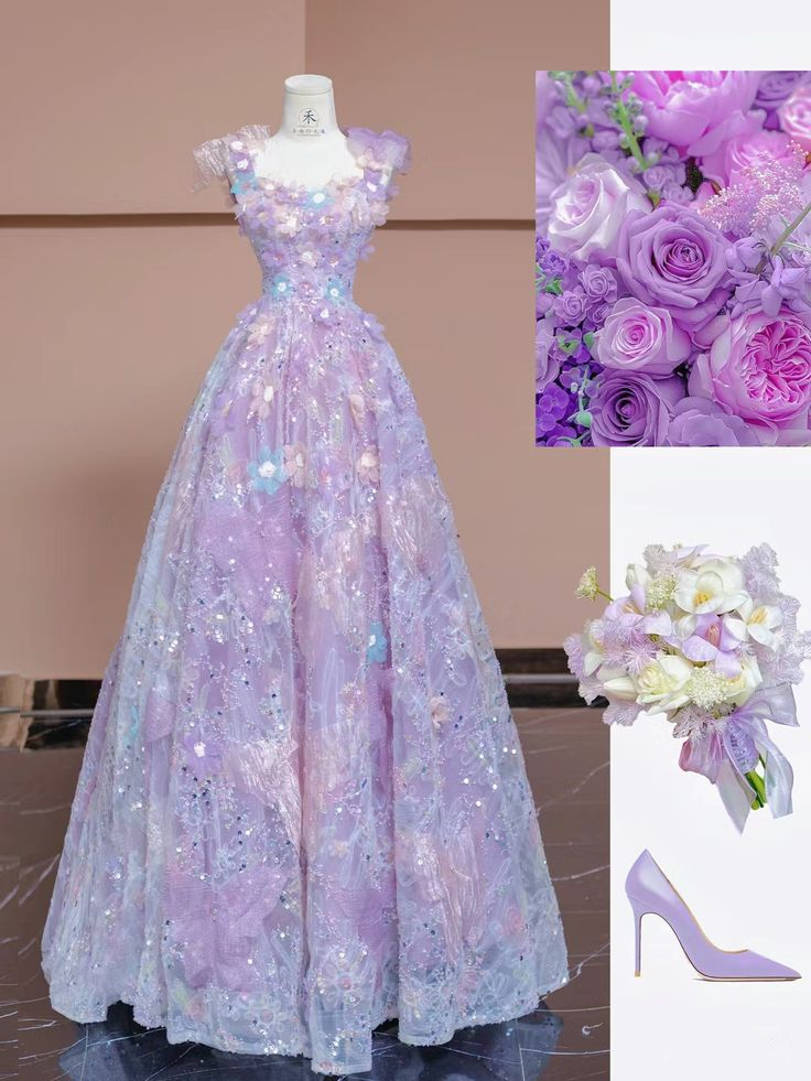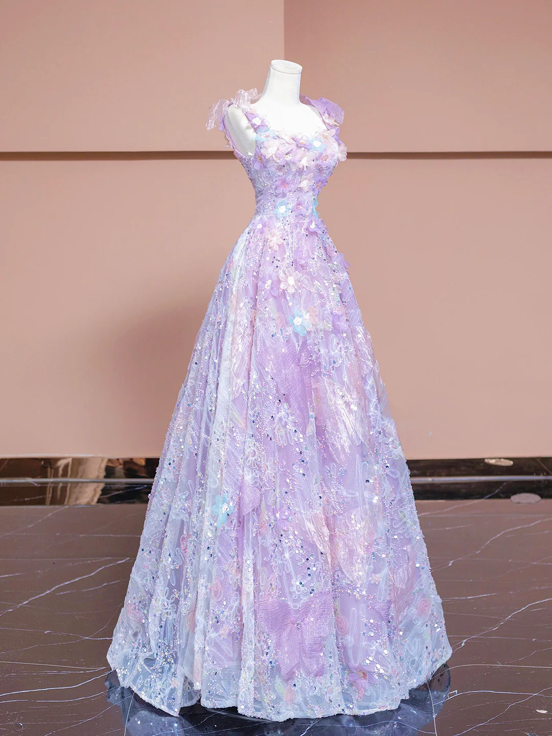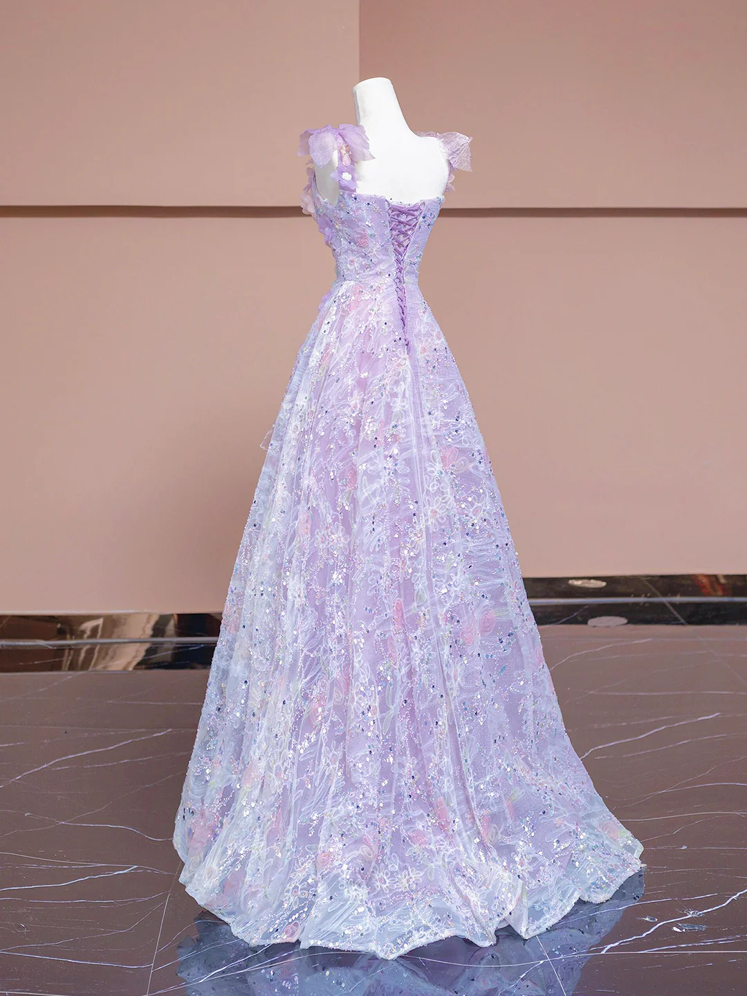 Light Purple Straps A-Line Lace Sequins Floral Long Formal Party Dress MD7808