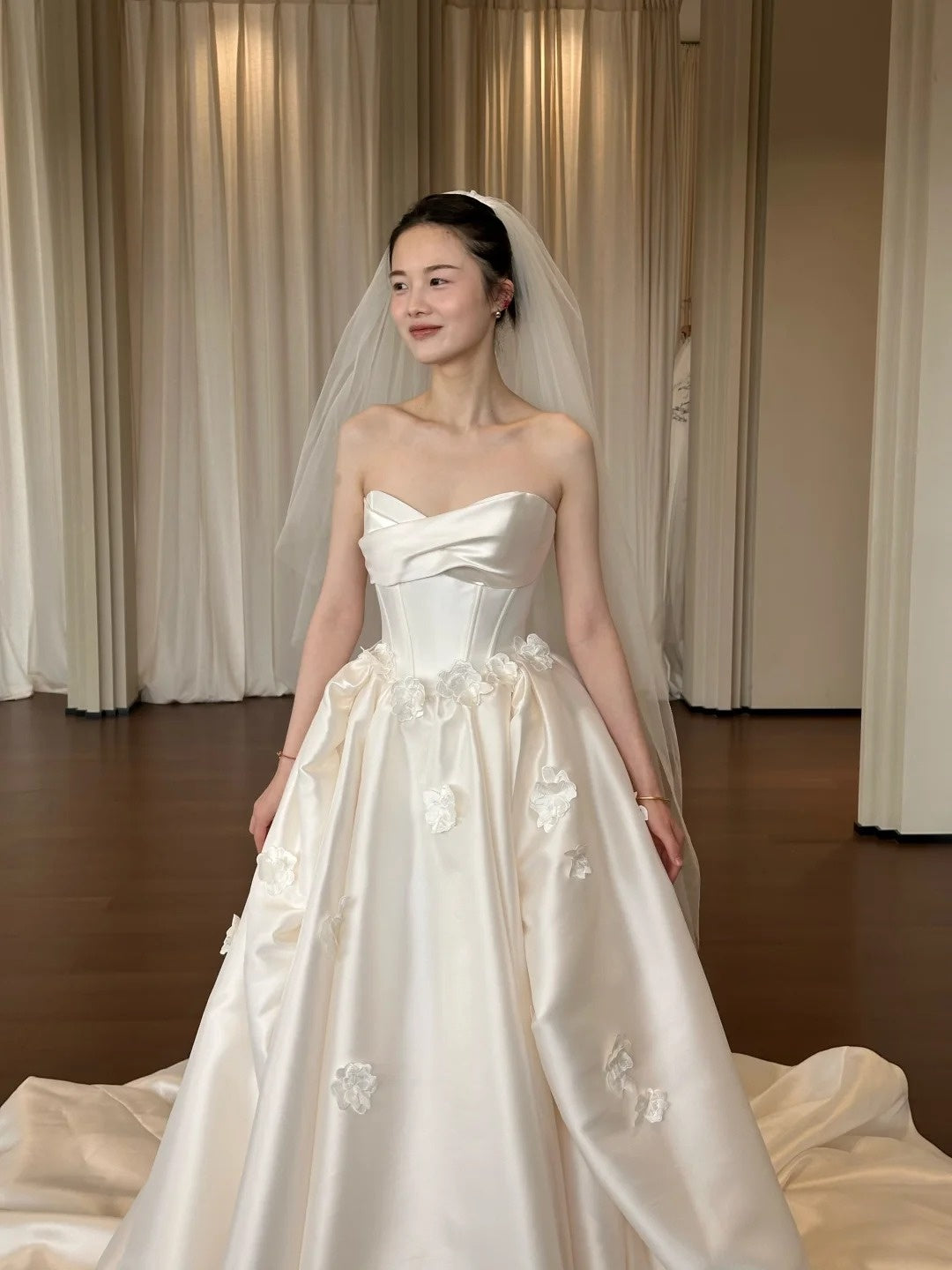 New Arrival Wedding Dress Satin Sweetheart Floral Pleated Wedding Dress D4616