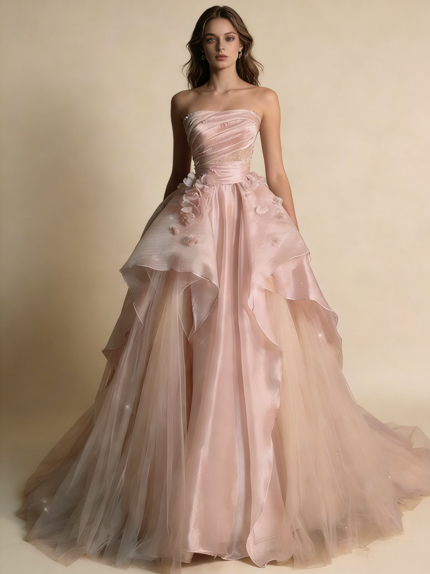 Pearl Pink Strapless A-Line Tulle Long Party Gown with Pearls MD7720
